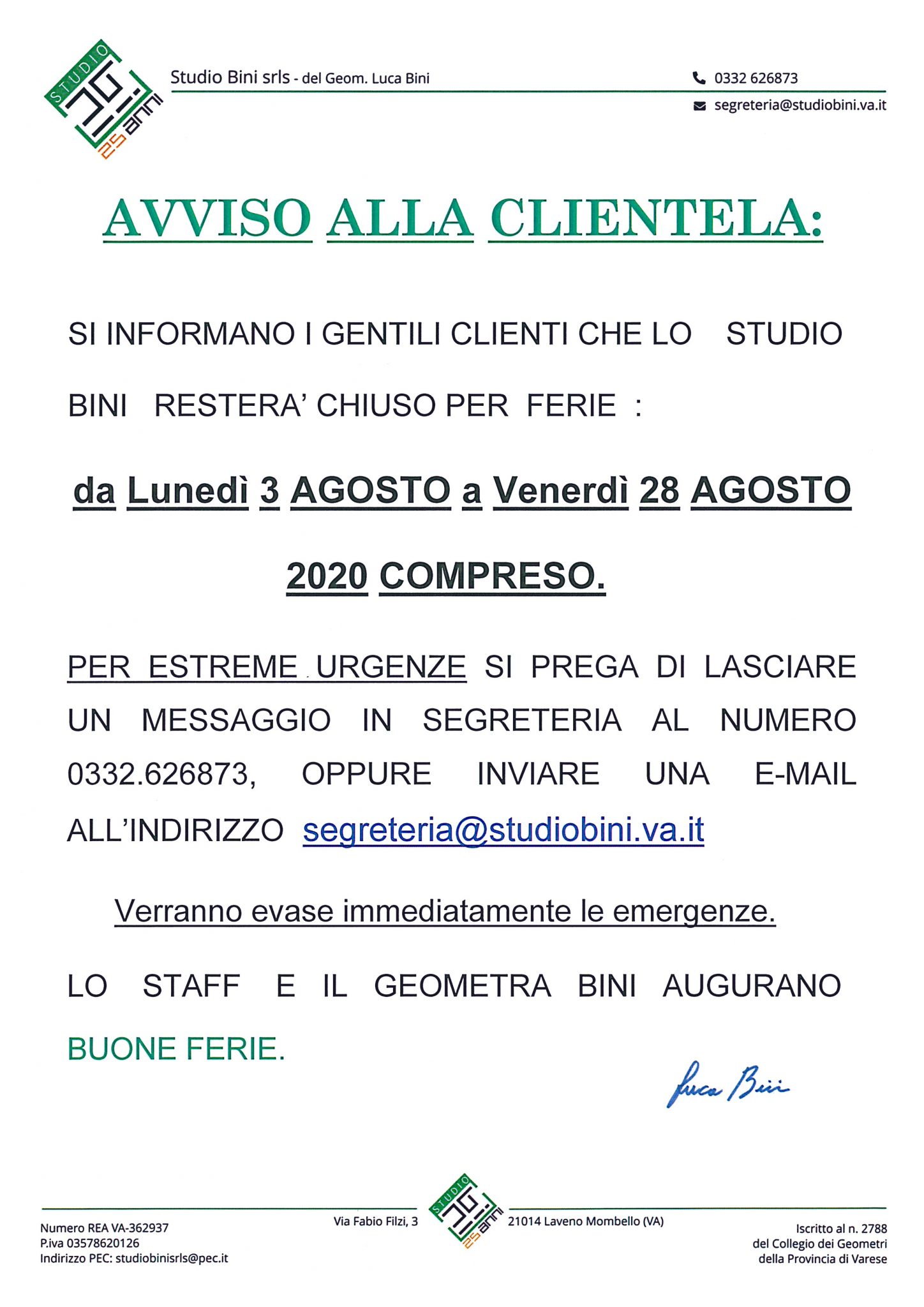 Per estreme urgenze si prega di lasciare un messaggio in segreteria al n. 0332.626873 oppure inviare una e-mail all’indirizzo ; segreteria@studiobini.va.it ; verranno evase immediatamente le emergenze.